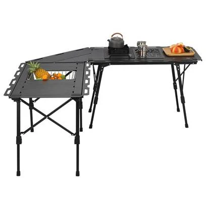 Alumīnija-dzelzs āra āra kempinga galds. Var pat izmantot telpās dažādiem mērķiem. Tās pielāgojamais dizains nodrošina, ka jūs varat izbaudīt tā funkcionalitāti un ērtības visur, kur jūs aizvedat uz jūsu piedzīvojumiem. Kad tas netiek izmantots, vienkārši salieciet galdu uz leju un novietojiet to prom stumbrā, skapī vai zem gultas, līdz jums tas atkal ir nepieciešams.