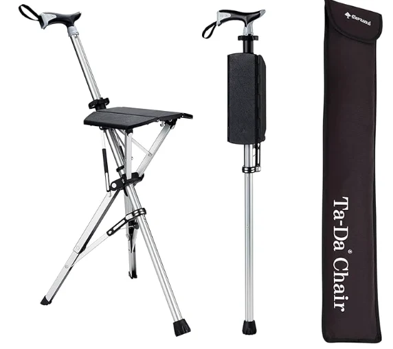 Veci vīrieši Alpenstokas pārgājiena niedru, atpūtas un pārgājienu nūja atbalsta saņemšanai. Šis dizains, kas uzreiz pārgājiena nūju pārvērš krēslā ar īslaicīgu, piedāvā atpūtu nogurušām kājām un ceļgaliem uz brīdi.