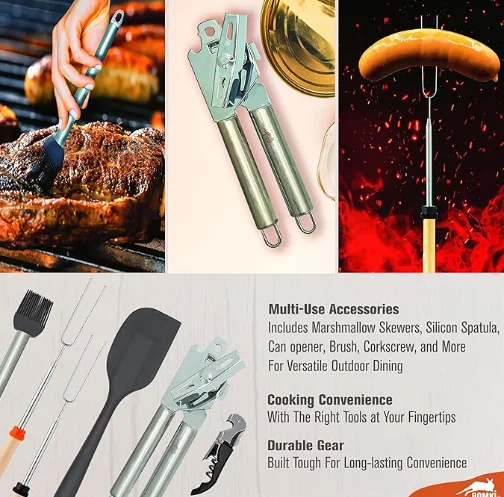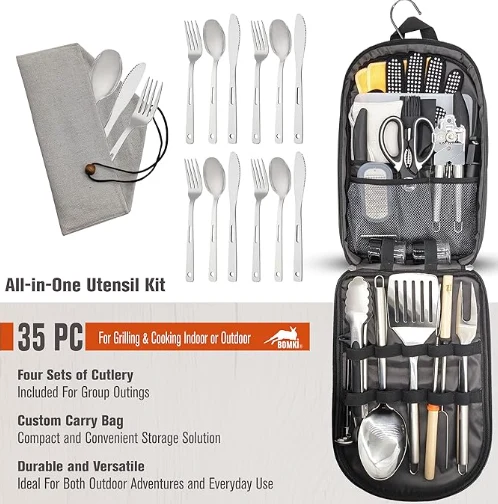 Āra kempinga virtuves piederumu glabāšanas maiss Šis 35 datoru kempinga gatavošanas piederumu komplekts ir pilnīgs risinājums jūsu ēdiena gatavošanas vajadzībām ārpus telpām. Tajā ietilpst kempinga virtuves komplekts un kempinga piederumi gatavošanas komplekts, visi glīti iesaiņoti pielāgotā somā ar papildu nodalījumiem un divām muguras kabatām. Komplekts ir paredzēts, lai rūpētos par visām jūsu kempingu ēdiena gatavošanas pamatiem, padarot to par neaizstājamu papildinājumu jūsu kempinga rīkam