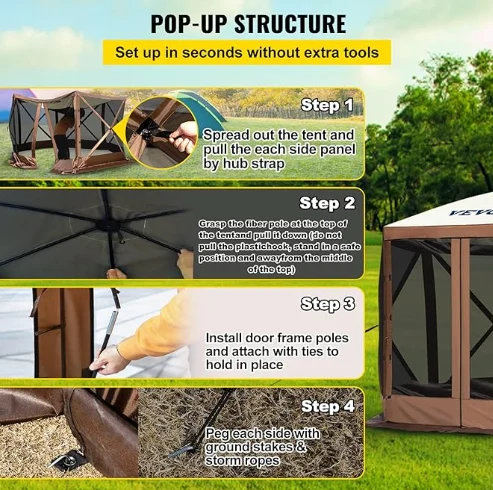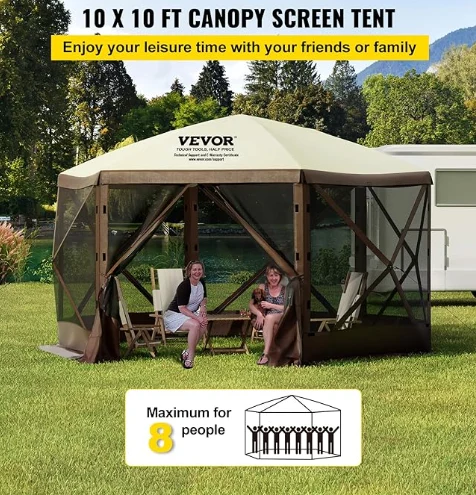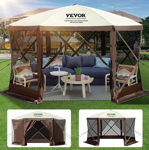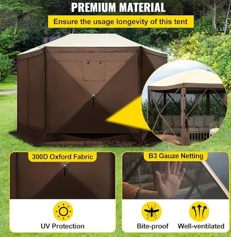 Lietus necaurlaidīgs Pergola kempinga nojumes telts, kempinga lapenes telts ir izgatavots no 300D Oxford Fabric un B3 marles linuma. Tas ir IPX3 ūdensnecaurlaidīgs, tauriņš un UV izturīgs pret UV. 12 'x 12' lapenes nojume nodrošina lielu vietu āra patversmes lietošanai.
