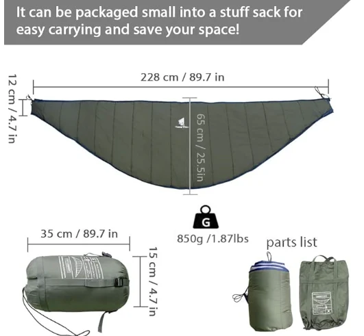 Ceļojuma kempinga šūpuļtīkls zem segas kempingam - 20d 380T ūdensnecaurlaidīgs neilona pleda auduma apvalks ar mīkstu 300 T poliestera pongee oderi; Zīda diegu pildījums, āda - draudzīga, ērta
